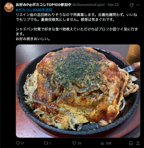 During the Vocaloid Collection, there are many people like this who are soliciting songs from other participants, both self-nominated and recommended by others, and I pushed my song over and over to these people.